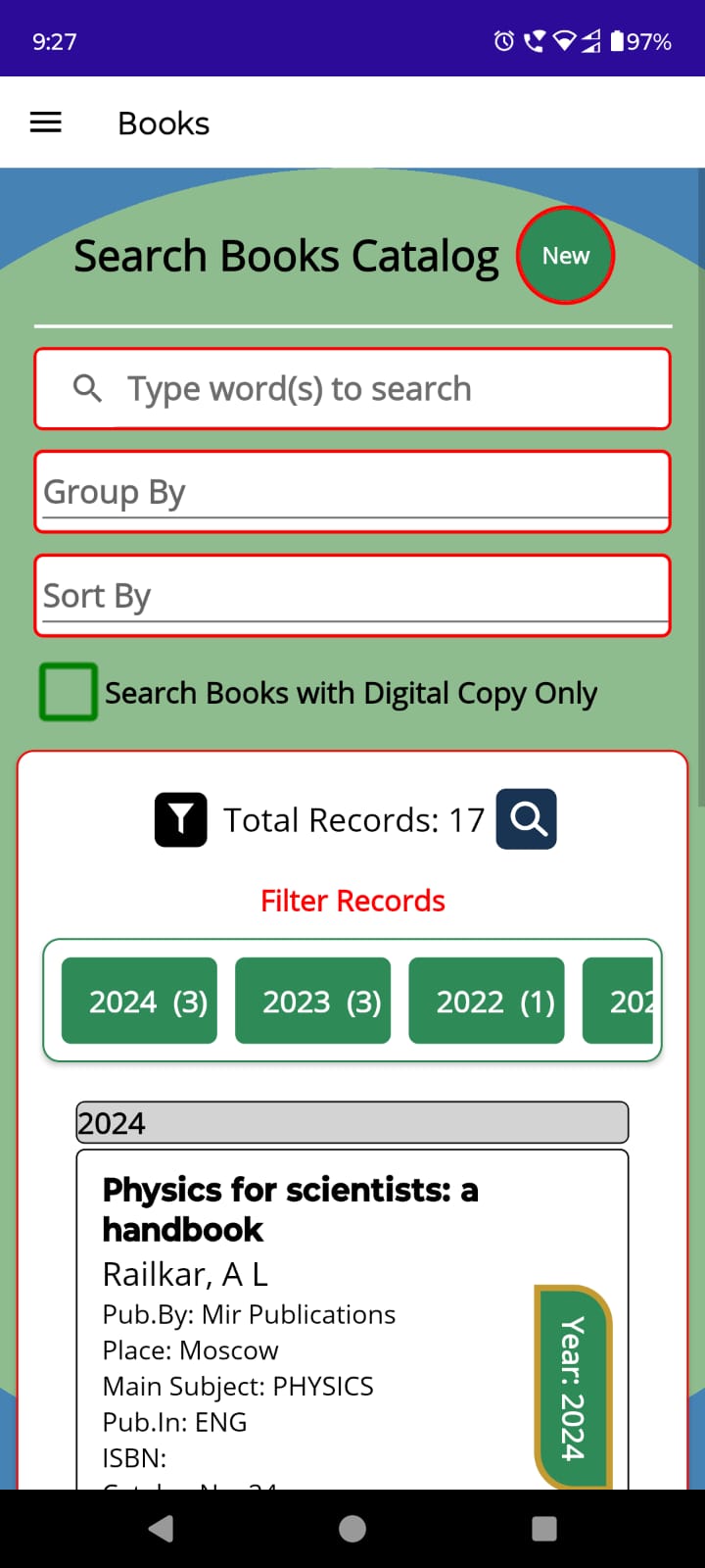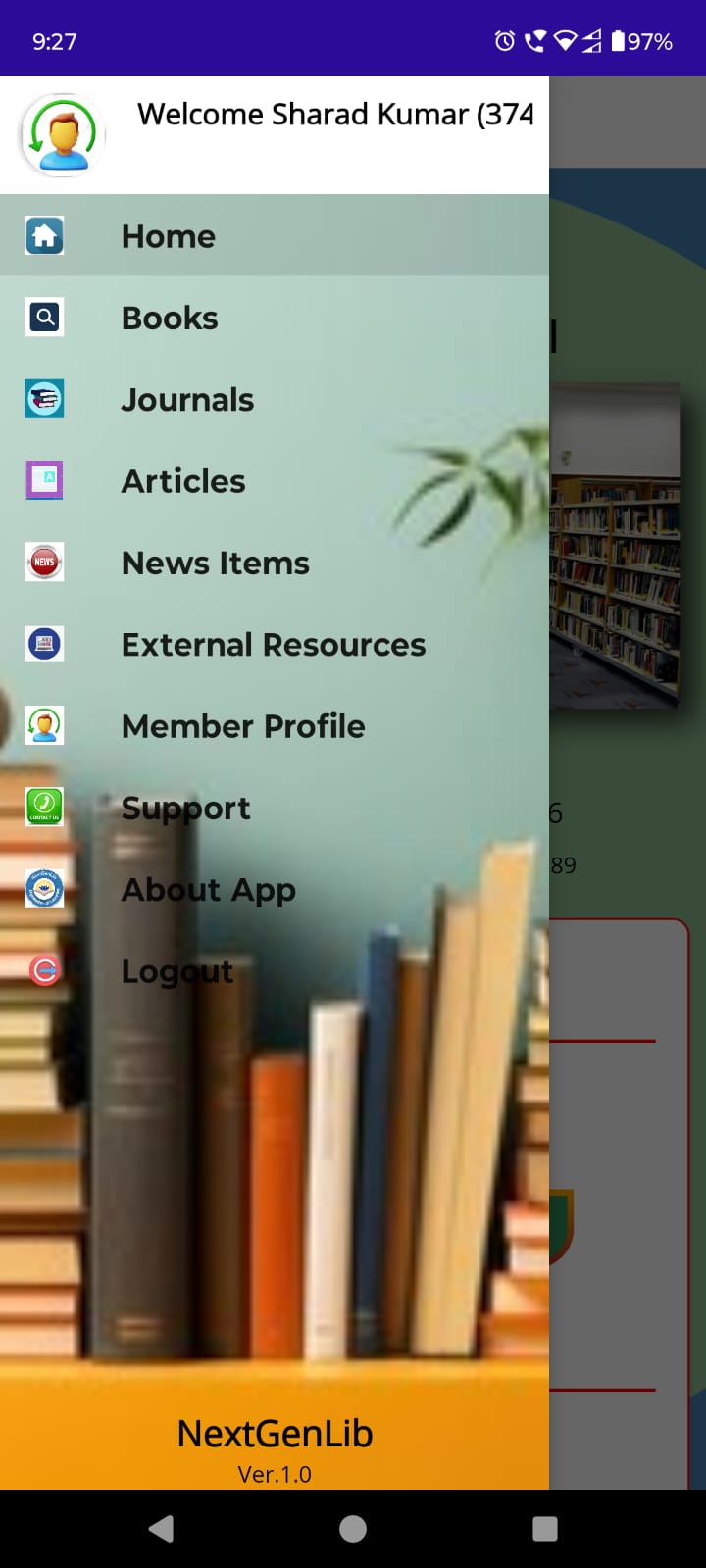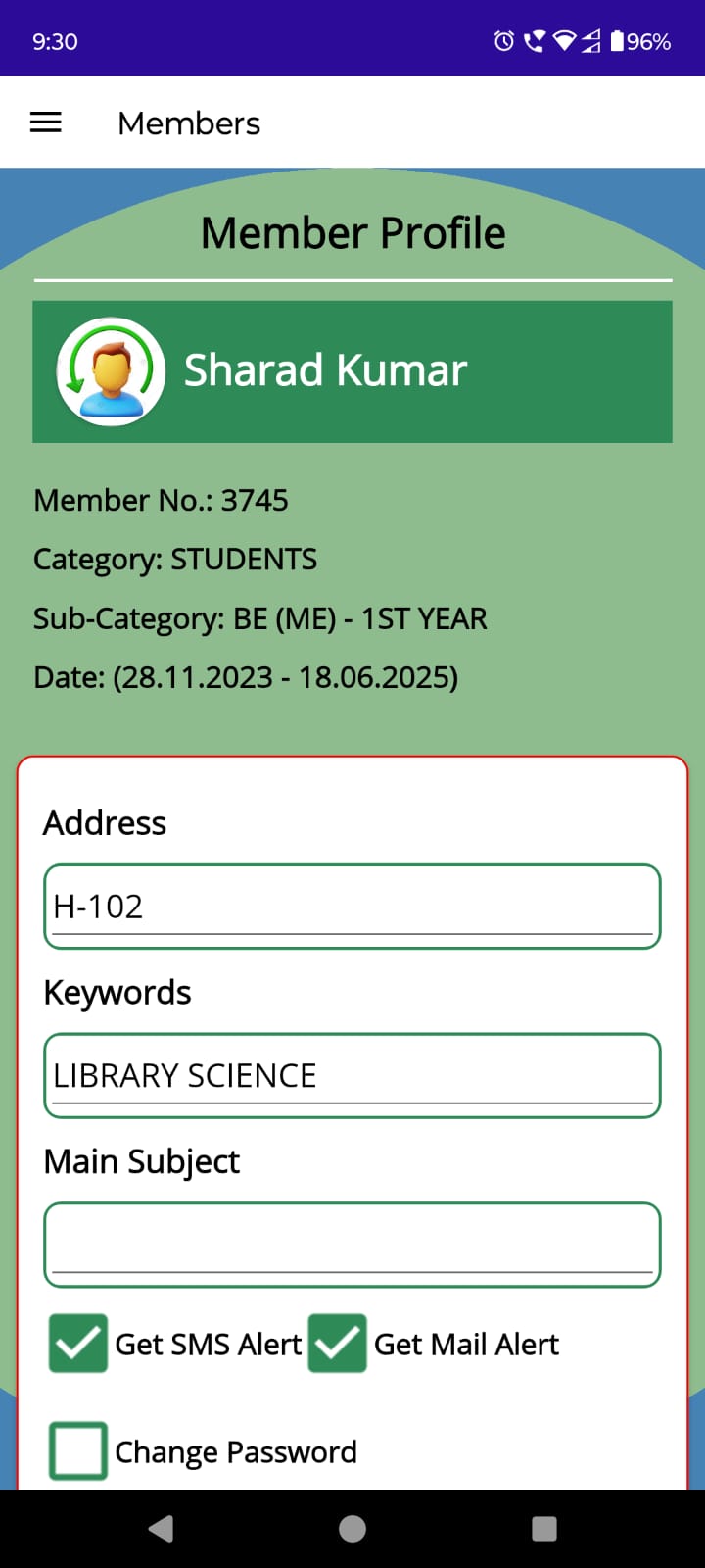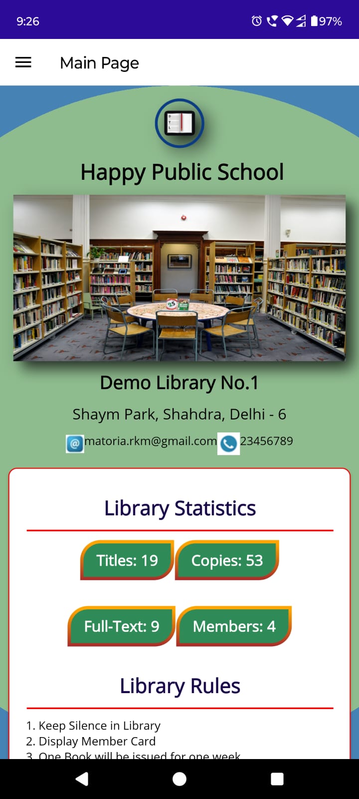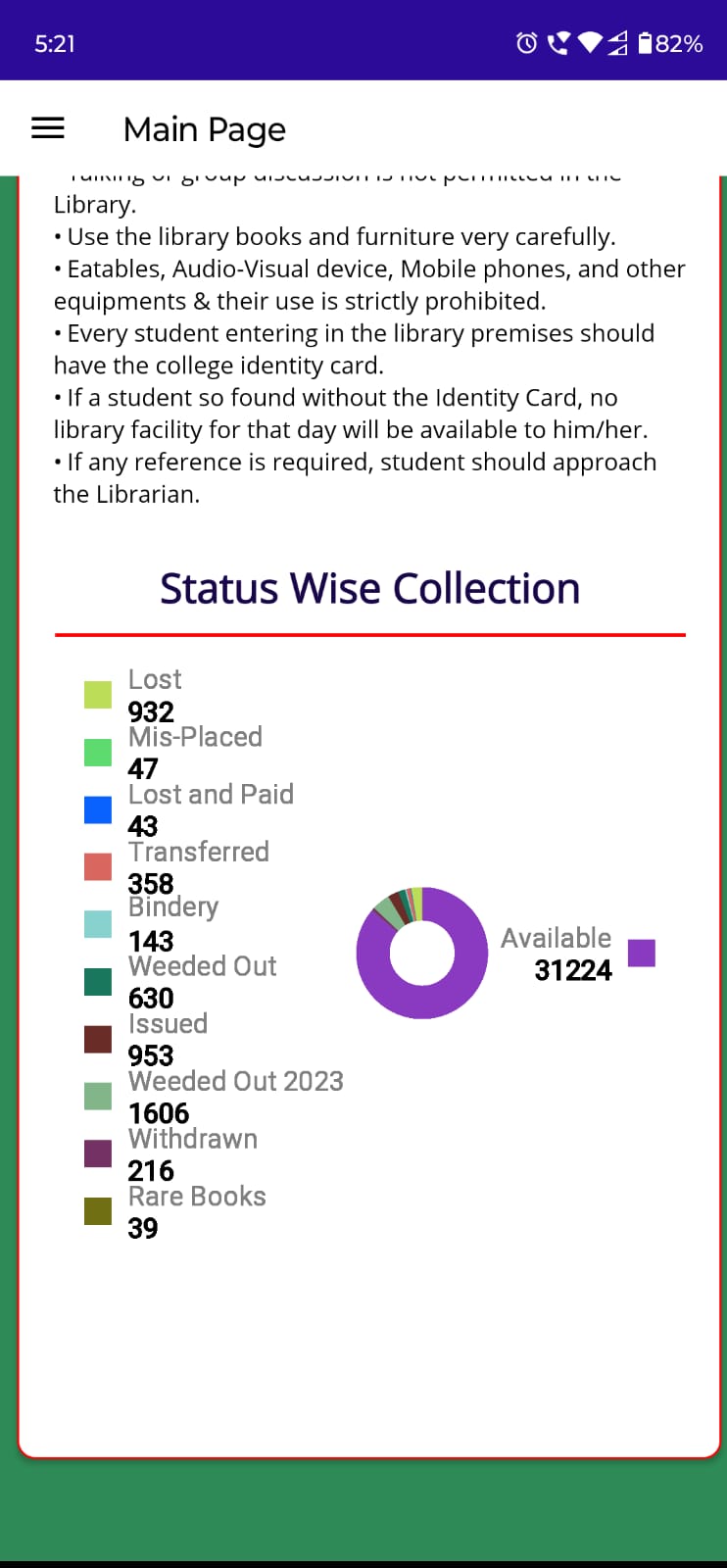 A Mobile App for registered members of the library also availble for Android Mobile bearer where they can install and login the App using their credentials passed by Library at the time of Registration. Using Mobile App, member can access e-library services including Catalog search, service requests, online reservation, full-text document downlaod and reading, member attendance during visit to library and many more. The Mobile app has been developed using MAUI Technology and consumes a restFul API for faster communication.