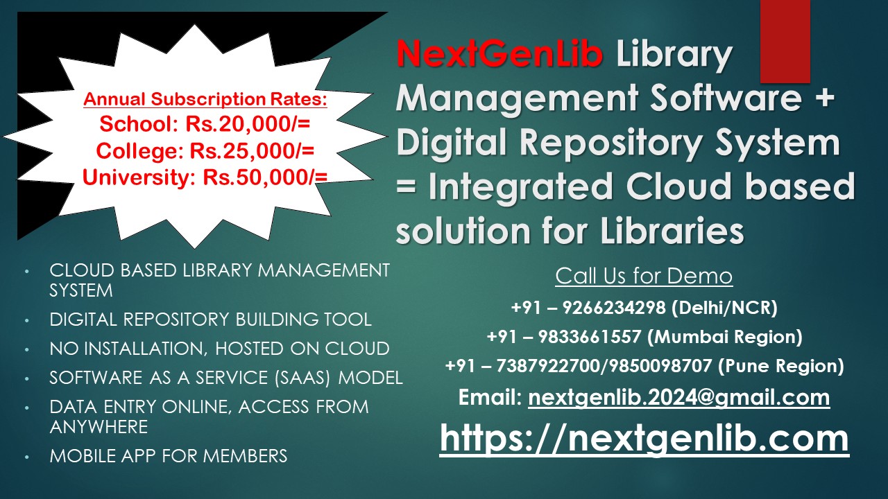 NextGenLib - is an integrated Library Management System plus a digital repository software, both are integrated and, thus, provides a single solution to the Indian Libraries for managing print as well as digital collections. The software is based on Cloud technology, hosted on fastest cloud and libraries can access online using Internet Desktops. No need to install any software in library desktop/server, no AMC, no maintenance and no backup activities are required at library end, rather all library related services are provided online at 24x7, access from anywhere, over any device, thus, library staff can focus on library services. Modern Libraries need to computerize their activities and services for which a simple software is required which may be easily utilized by library staff. NextGenLib is such software which is easy to use and maintained by agency on cloud. Library staff not required to maintain it at library end, no backup activity, etc. This software is very useful to schools, colleges and university libraries. Software provides access to catalogs of local collection, access to digital collection uploaded in software, plus access to public digital collection hosted on internet by other institutions. This software, so to say, is a four-in-one software – first for automating in house activities in a library; second for automating information services to users to provide online services using mobile app; and third for building up an institutional digital repository of your own publications adding further therein e-books, rare e-books, newspaper item, etc. of your interest. You may not need to use a separate digital library software such as Dspace or e-Print or Bridgestone Digital Library, etc. And Last, not the least, software provides facility to hyperlink various external resources (either paid/subscribed or free/open access) available on Internet as now a days these are very useful for library members.
